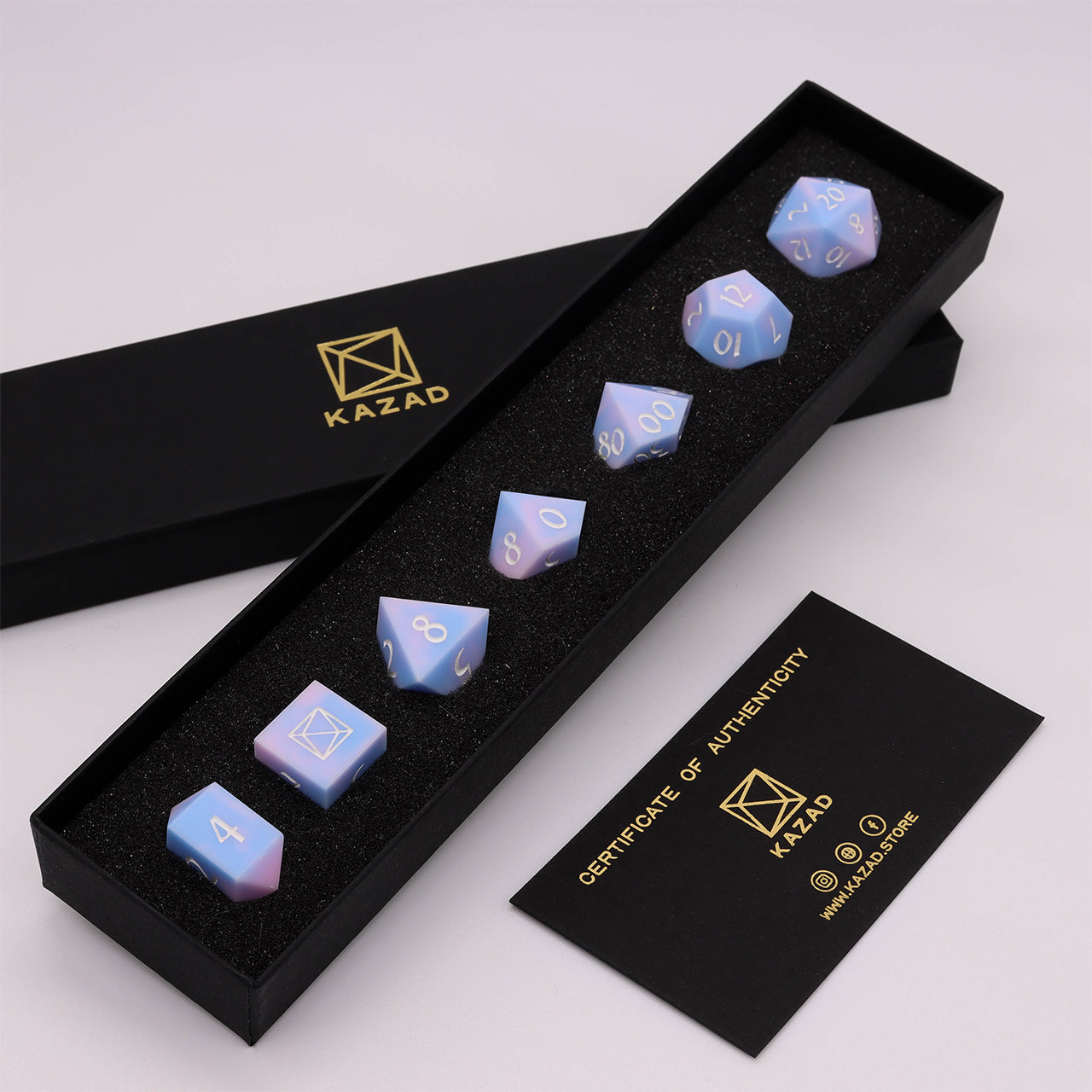 D6 has got KAZAD logo instead of nr 6. This set includes d4,d6,d8,d10,d%,d12,d20 and a certificate of authenticity.