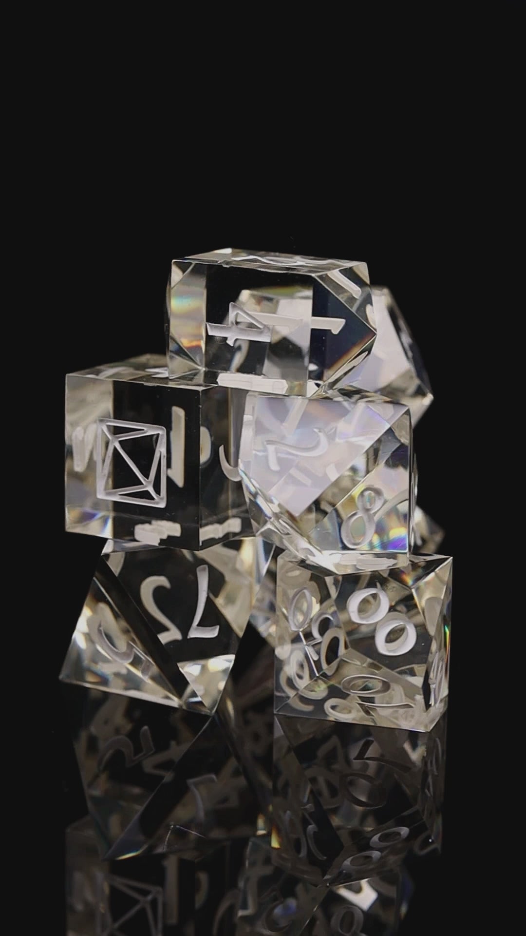 Transparent resin, polished to high gloss, inked with white paint. D6 has got KAZAD logo instead of nr 6. This set includes d4,d6,d8,d10,d%,d12,d20 and a certificate of authenticity. Dice come packed in elegant gift box with KAZAD logo.
