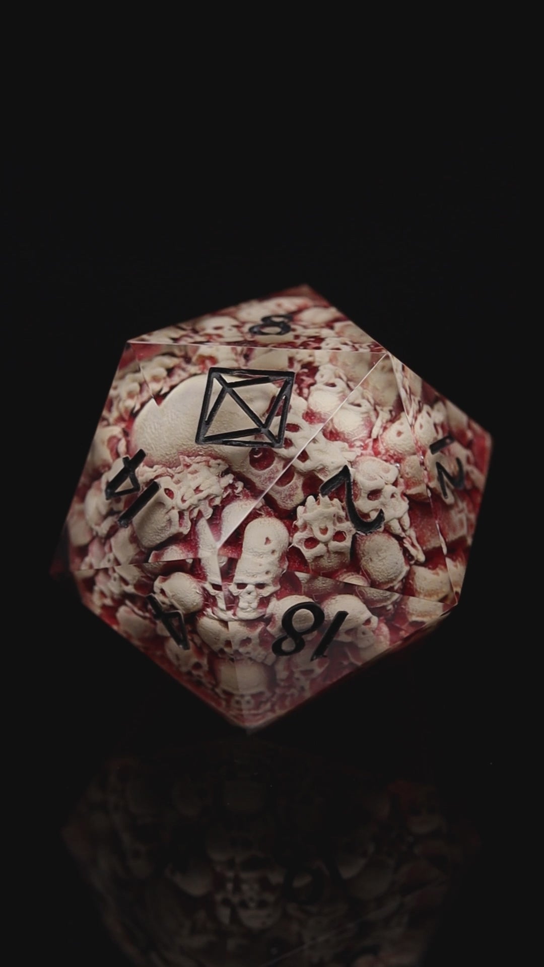 Transparent resin, with handpainted skulls inside dice, polished to high gloss, inked with black matte paint. Skulls are only visible on the upper half of the dice, the lower half is a base for skulls. See video. There's KAZAD logo on 20's face. Dice come packed in elegant gift box with KAZAD logo and certificate of authenticity.