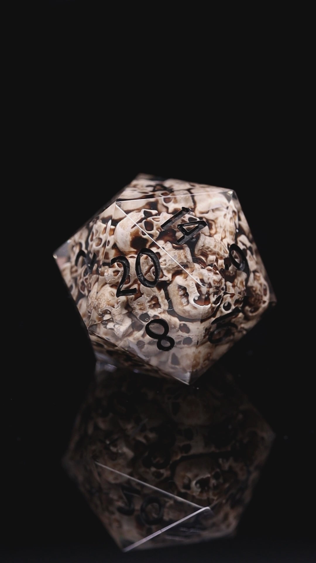 Transparent resin, with handpainted skulls inside dice, polished to high gloss, inked with black paint. This includes D20. Dice come packed in elegant gift box with KAZAD logo.