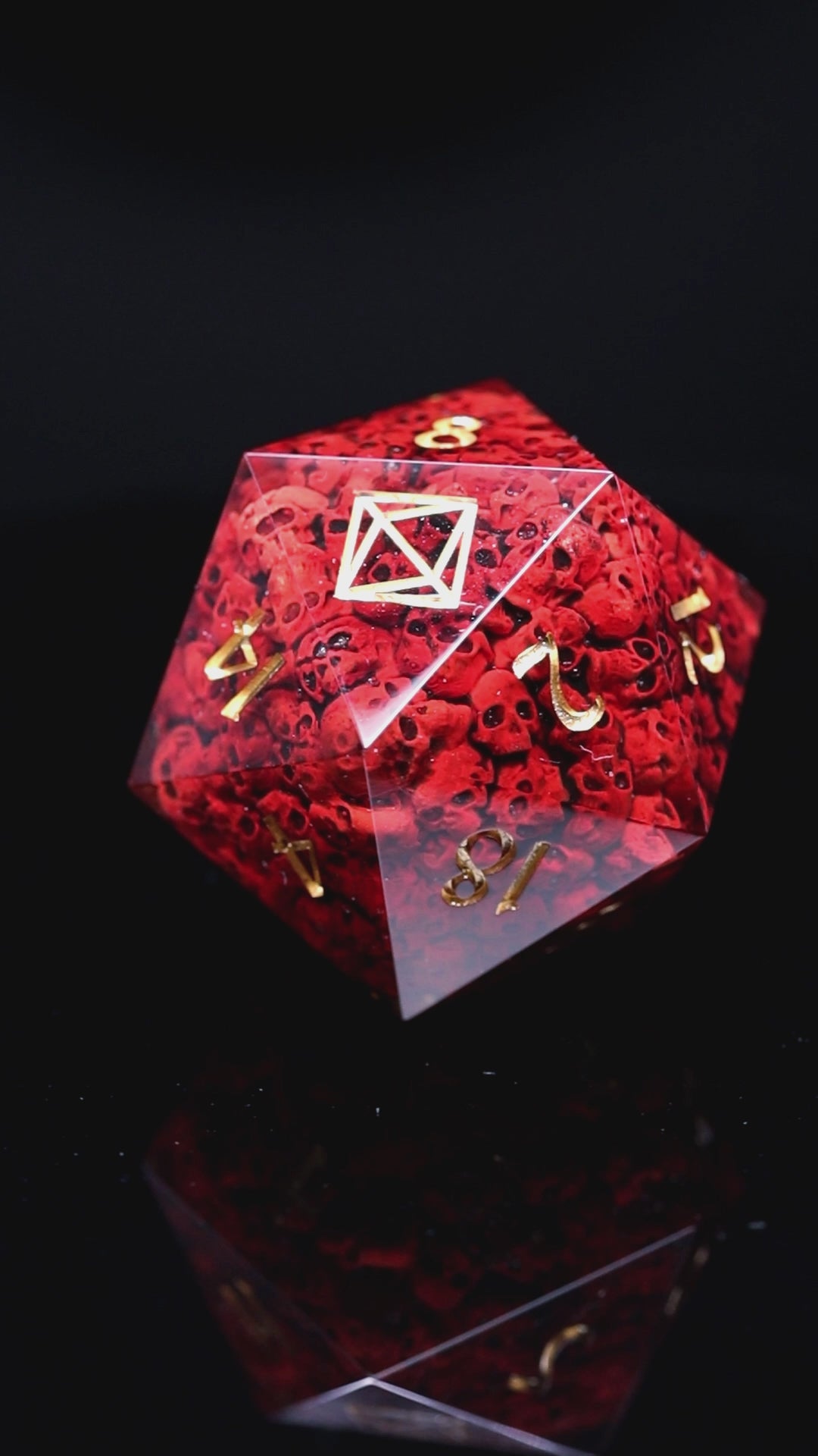 Transparent resin, with handpainted skulls inside dice, polished to high gloss, inked with liquid gold paint. This includes D20. Dice come packed in elegant gift box with KAZAD logo. Insert is made using same resin like rest of the dice making it perfectly balanced.
