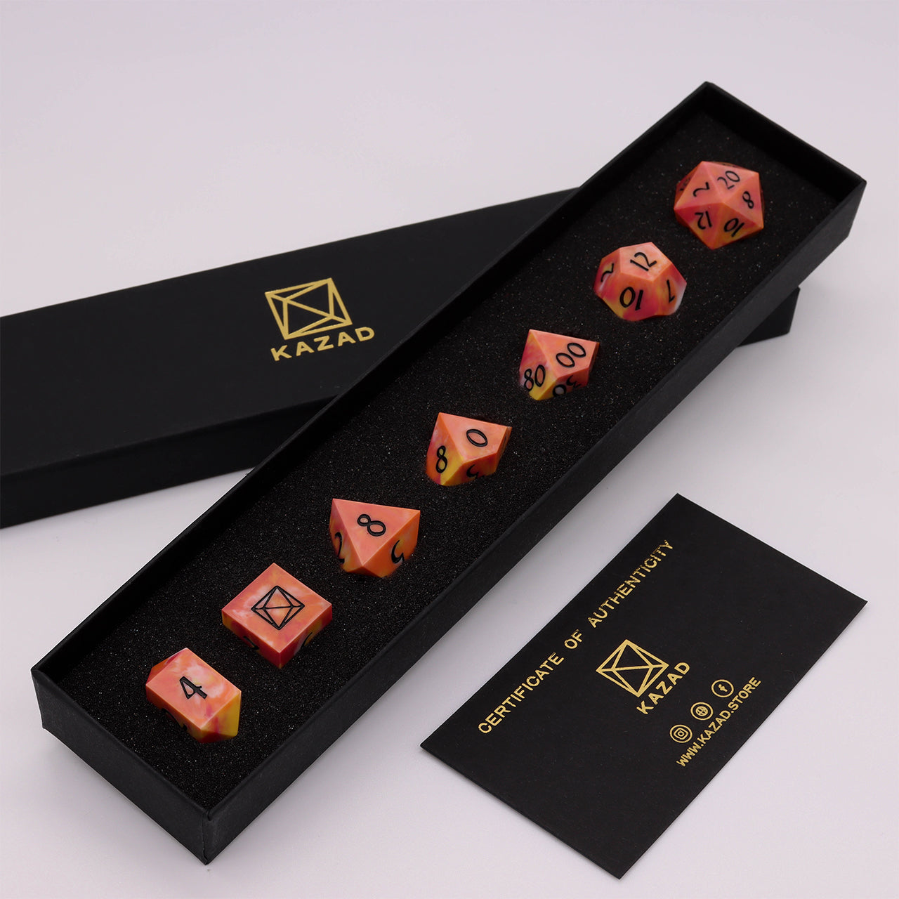 D6 has got KAZAD logo instead of nr 6. This set includes d4,d6,d8,d10,d%,d12,d20 and a certificate of authenticity.