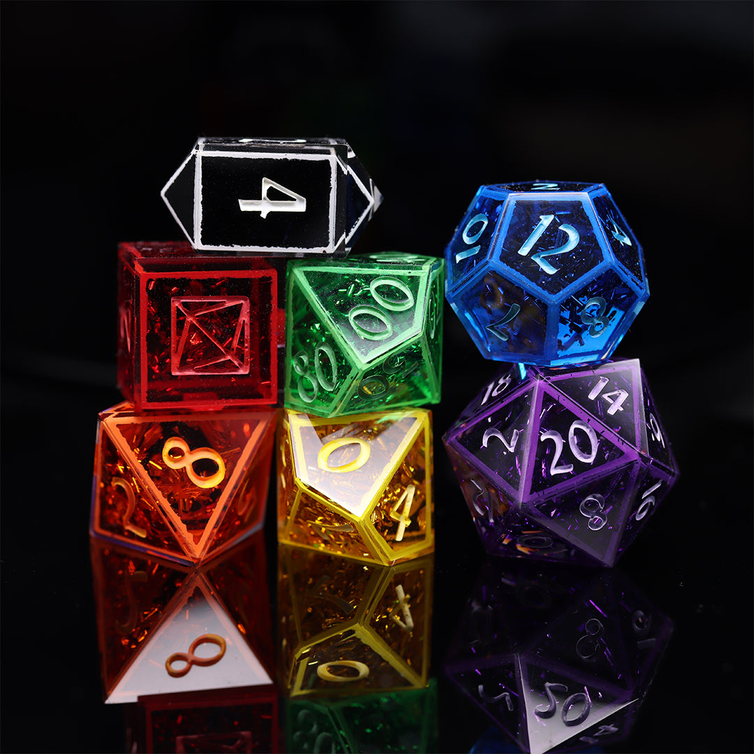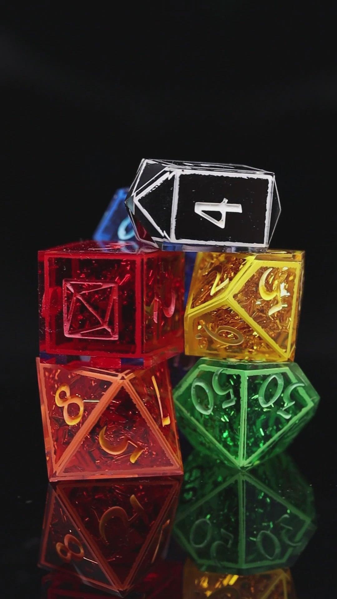 Colored transparent resin, double casted - inserts are handpainted. Theres colored shiny metallic foil inside every dice. Set polished to high gloss, inked with two shades on every dice with acrylic paint. D6 has got KAZAD logo instead of nr 6. This set includes d4,d6,d8,d10,d%,d12,d20 and a certificate of authenticity. Dice come packed in elegant gift box with KAZAD logo.