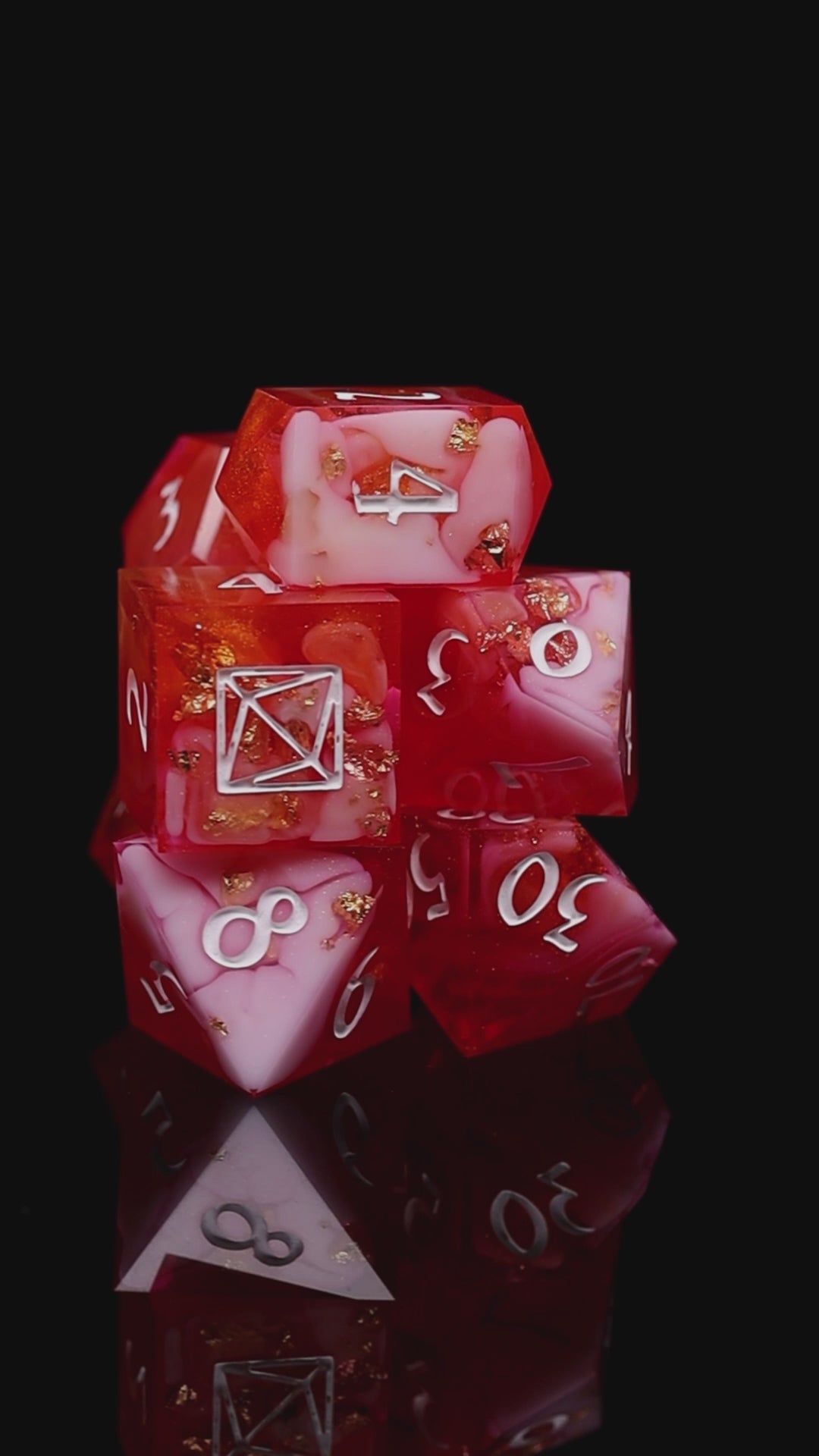 D6 has got KAZAD logo instead of nr 6. This set includes d4,d6,d8,d10,d%,d12,d20 and a certificate of authenticity.