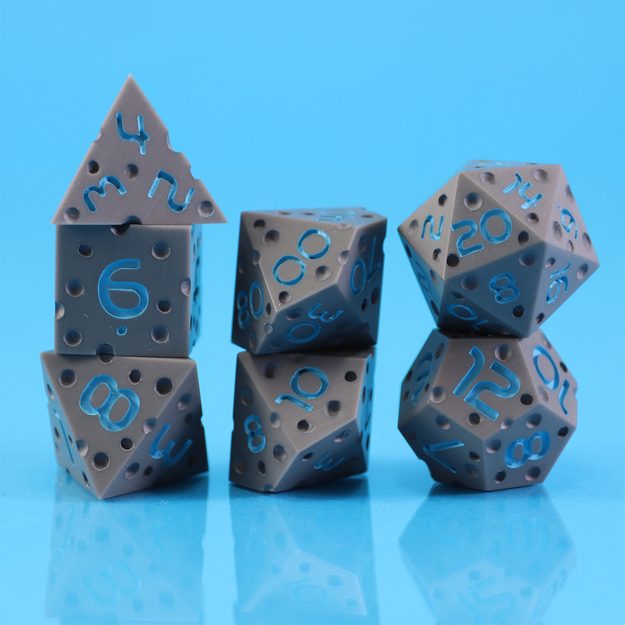 Opaque gray resin, matte finish, inked with blue paint. On each face of dice there is similar amount of drilled holes, therefore they dont impact on balance.