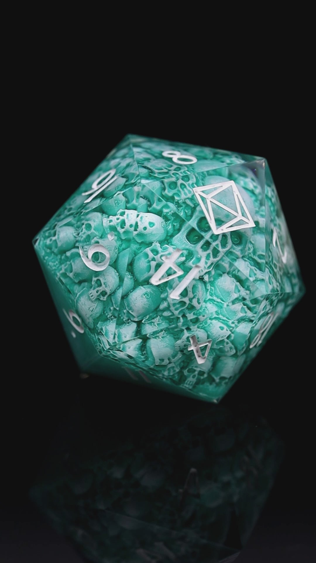 Transparent resin, with handpainted skulls inside dice, polished to high gloss, inked with white paint. Skulls are only visible on the upper half of the dice, the lower half is a darker base for skulls. See video. There's KAZAD logo on 20's face. Dice come packed in elegant gift box with KAZAD logo and certificate of authenticity.