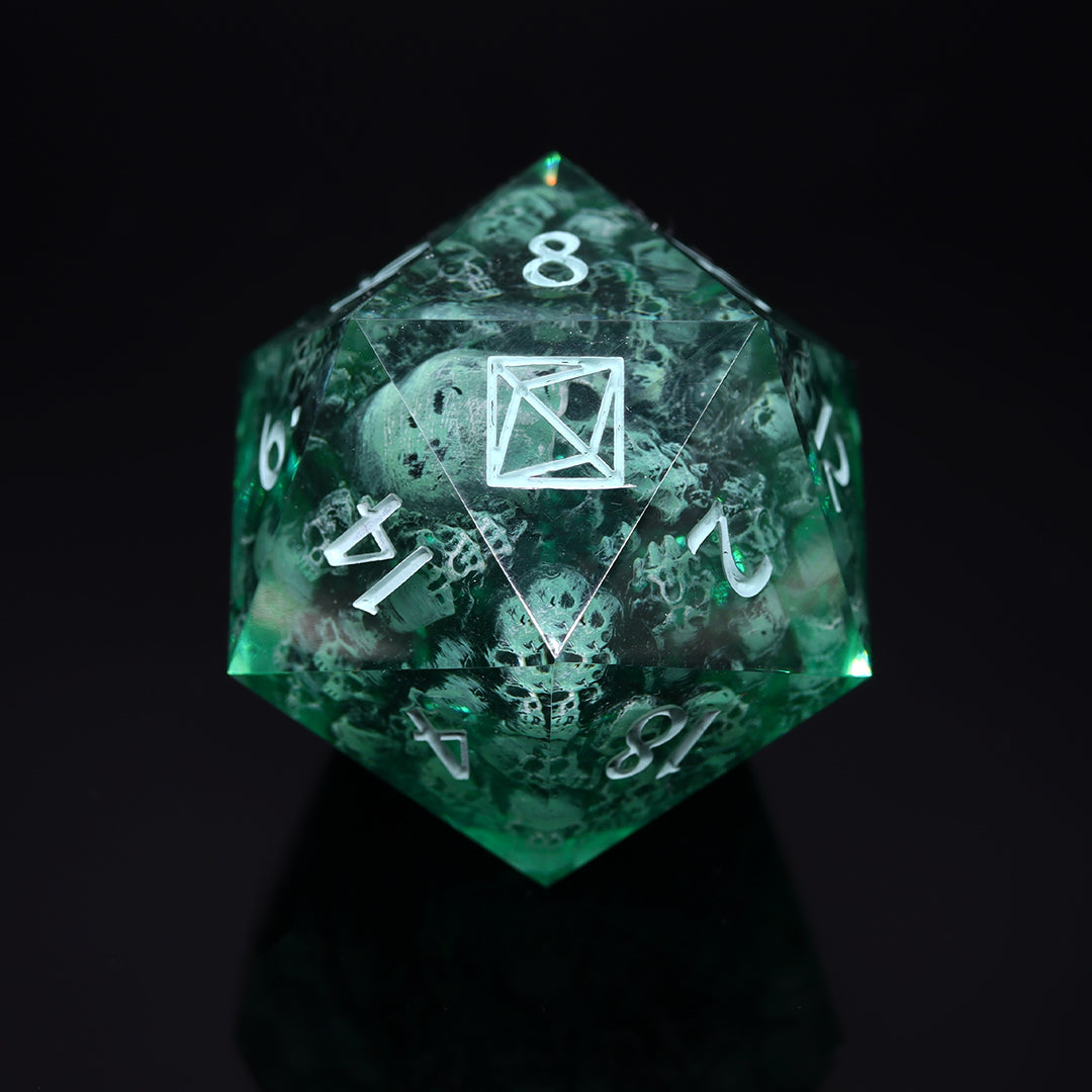 Transparent resin, with handpainted skulls inside dice, polished to high gloss, inked with gold paint. Skulls are only visible on the upper half of the dice, the lower half is a base for skulls. See video. There's KAZAD logo on 20's face. Dice come packed in elegant gift box with KAZAD logo and certificate of authenticity.