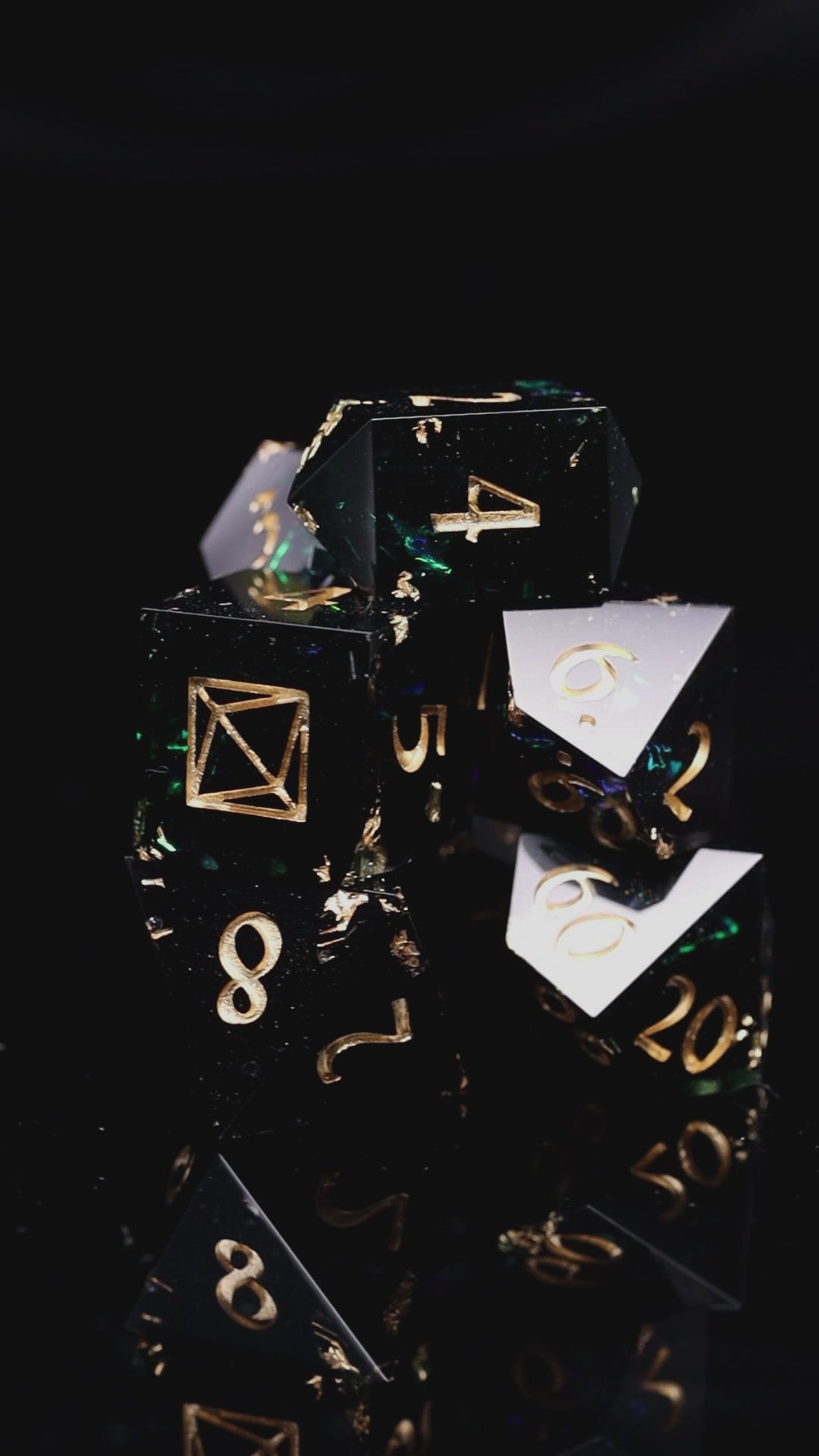 D6 has got KAZAD logo instead of nr 6. This set includes d4,d6,d8,d10,d%,d12,d20 and a certificate of authenticity.