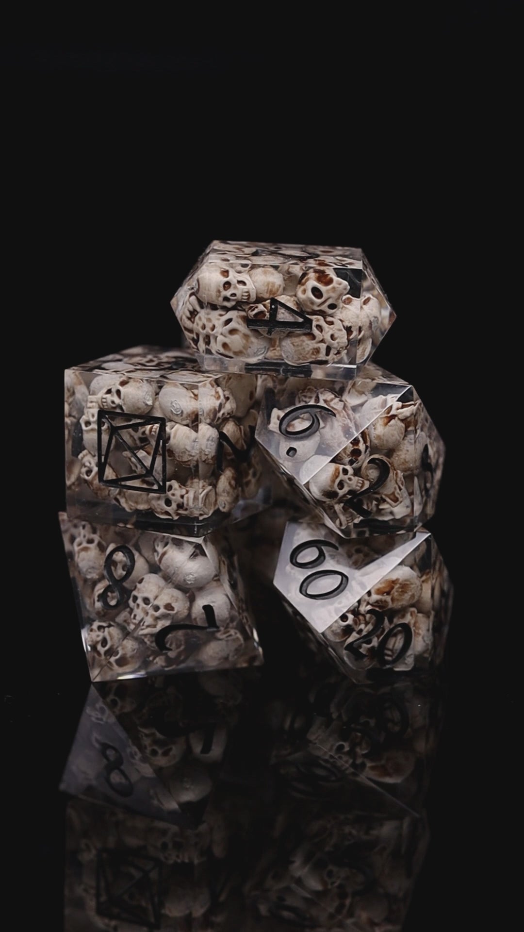 Transparent resin, with approximately 250 handpainted skulls inside dice, polished to high gloss, inked with black matte paint. D6 has got KAZAD logo instead of nr 6. This set includes d4,d6,d8,d10,d%,d12,d20 and a certificate of authenticity. Dice come packed in elegant gift box with KAZAD logo.
