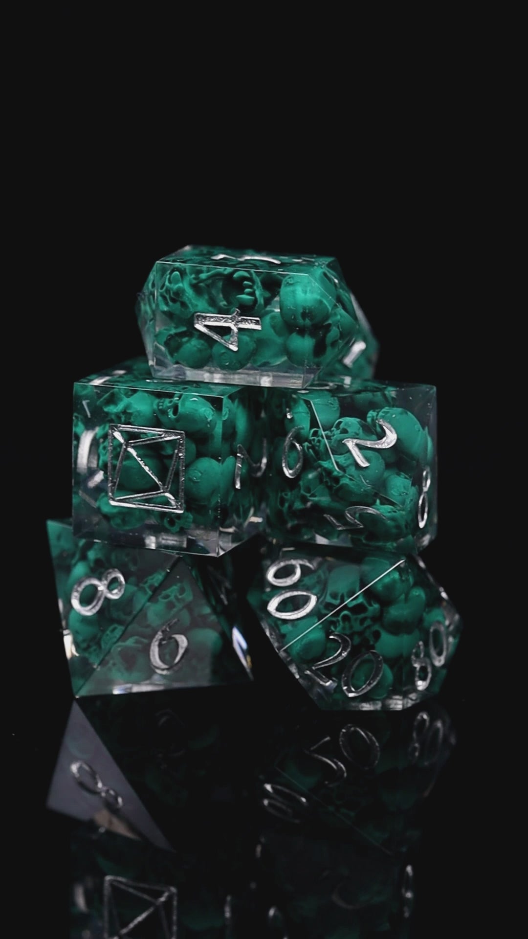 Transparent resin, with approximately 250 handpainted skulls inside dice, polished to high gloss, inked with liquid silver paint. D6 has got KAZAD logo instead of nr 6. This set includes d4,d6,d8,d10,d%,d12,d20 and a certificate of authenticity. Dice come packed in elegant gift box with KAZAD logo.
