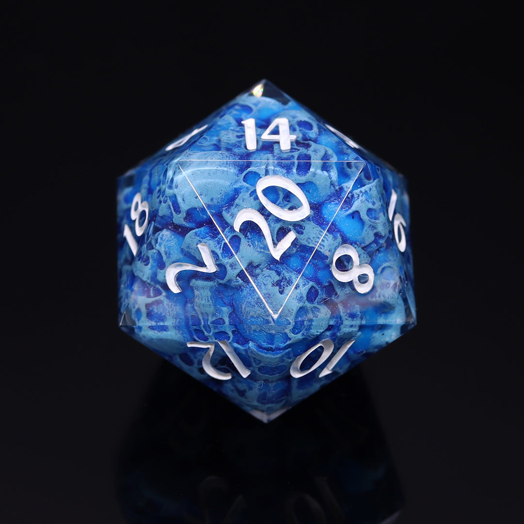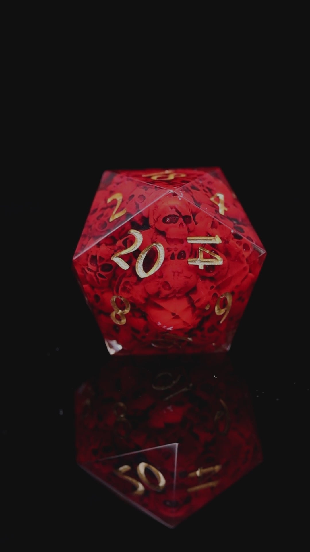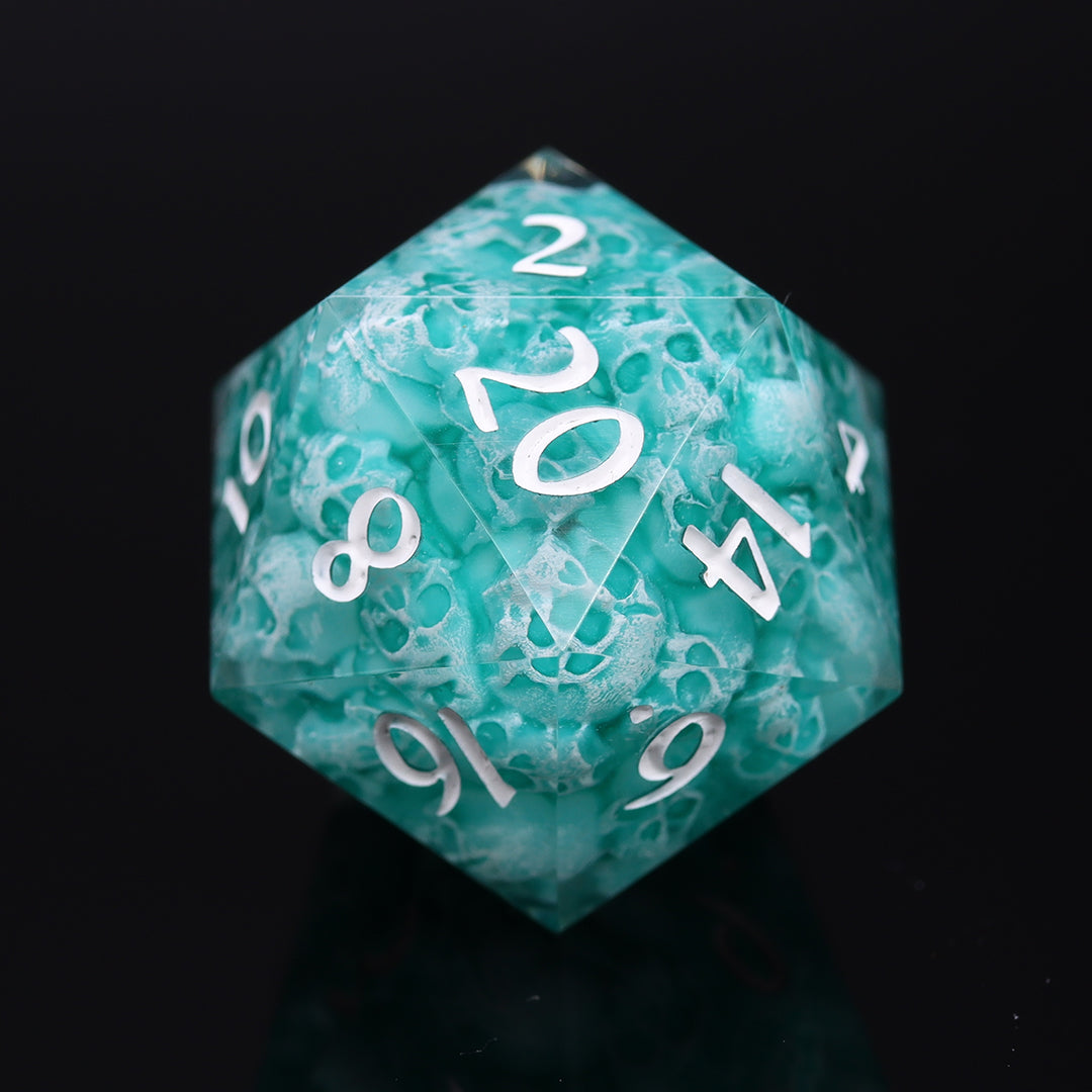 Insert is made using same resin like rest of the dice making it perfectly balanced. Transparent resin, with handpainted skulls inside dice, polished to high gloss, inked with gold paint. This includes d20. Dice come packed in elegant gift box with KAZAD logo.
